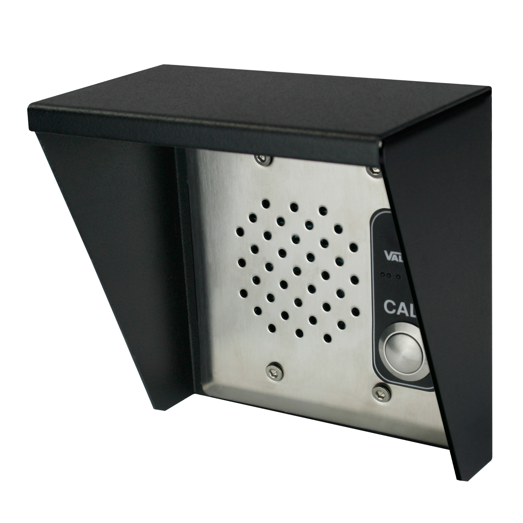 The V-9910 Weather Guard provides protection from precipitation and foreign objects which may compromise the operation of a doorplate speaker. The enclosure is made of steel with either a durable black or yellow powder-coated finish. (Not for V-1074 Surface Mount Intercom Doorplate.)