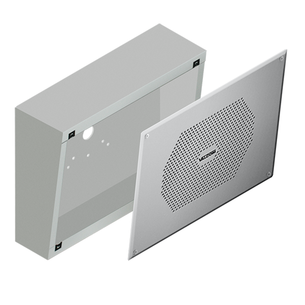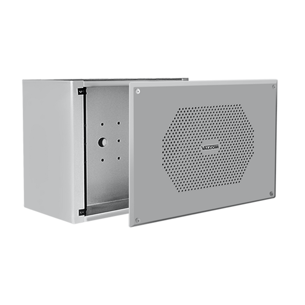 The V-9809 Vandal-Resistant Enclosure and Faceplate provide protection for Valcom FlexHorn™ in gymnasiums and other high-damage areas. FlexHorn™ is not included.