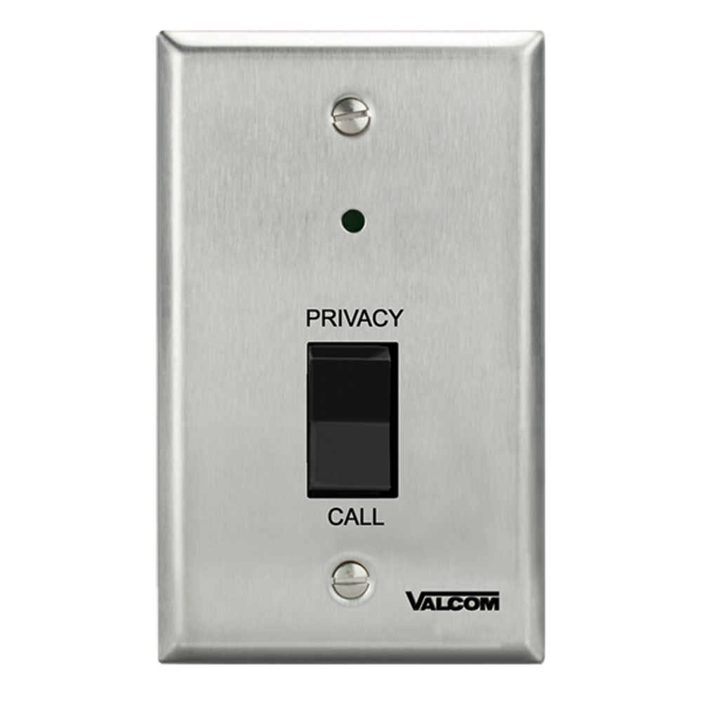 The V-9320 is a Call-In Button with Privacy Switch and Volume Control provides a three-position rocker switch and volume control. When the button is activated in the momentary “CALL” position, an intercom call is initiated to the Administrative phone. When the button is moved to the “PRIVACY” position, paging communication from the Administrative phone to the speaker is possible, but communication from the speaker to the Administrative phone is blocked until another call is initiated from the same device. This prevents the Administrative phone from monitoring the sound at the speaker.