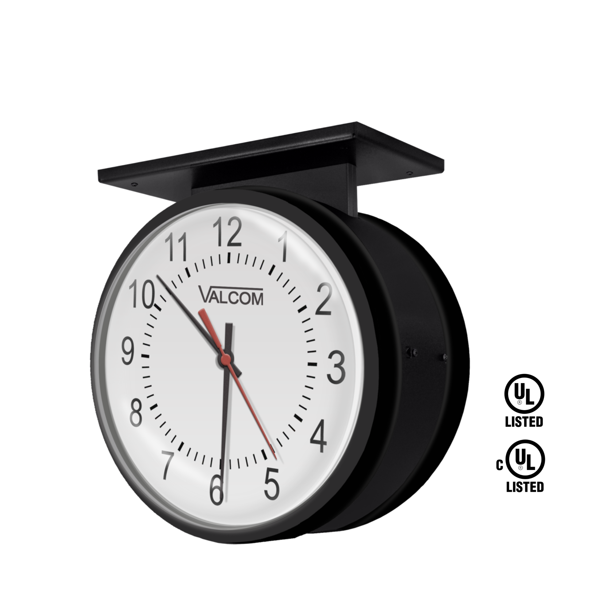 Valcom's IP PoE 16-Inch Analog Clock, Double-Sided enables time indication, synchronization, and correction over a simple network connection. This allows locating a clock display anywhere on the network. Program Clock synchronization to any NTP (Network Time Protocol) server.