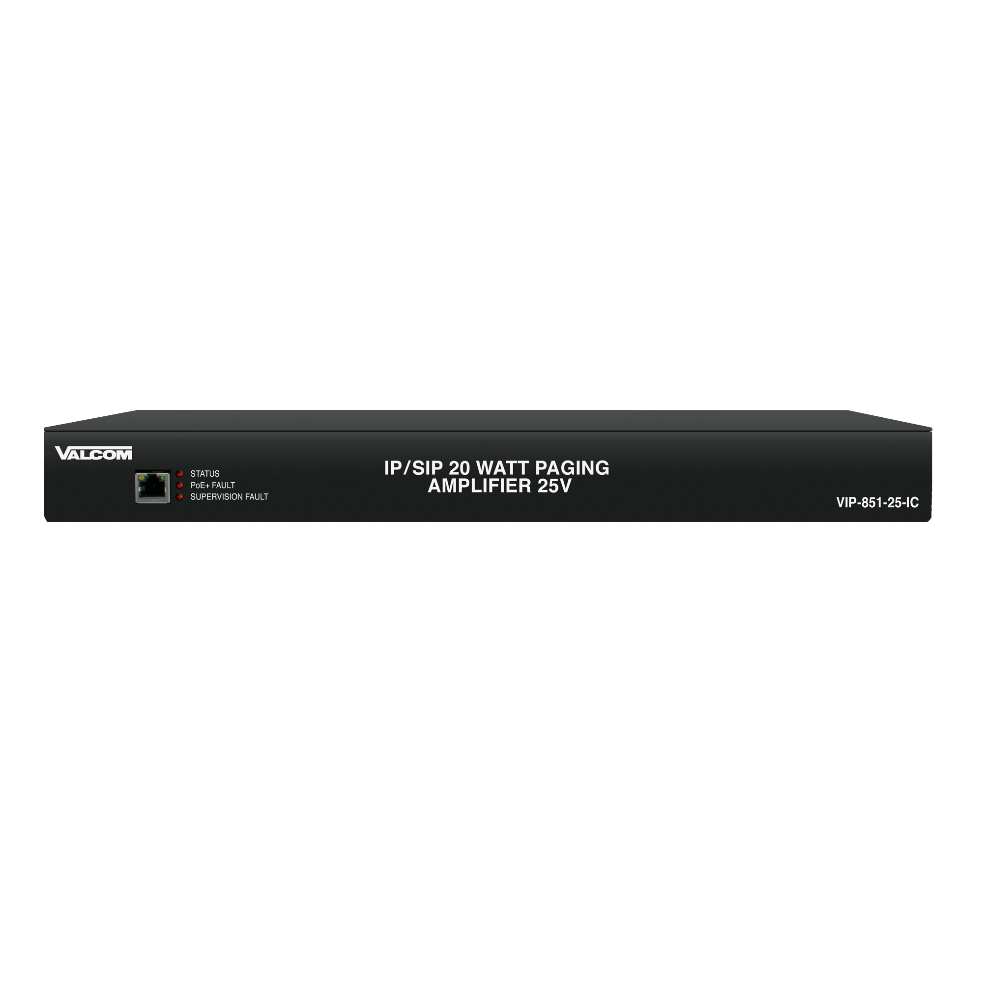 Valcom's VIP-851-25-IC, InformaCast® SIP 20-Watt Gateway 25 V enables voice access to a single zone of one-way paging over an IP network, allowing page zones to be extended anywhere network connectivity is available. The VIP-851-25-IC can be programmed as a SIP (Session Initiation Protocol) device for connectivity to virtually any VoIP (Voice over IP) telephone system. The VIP-851-25-IC has output connections for line level and 25 V speakers only.