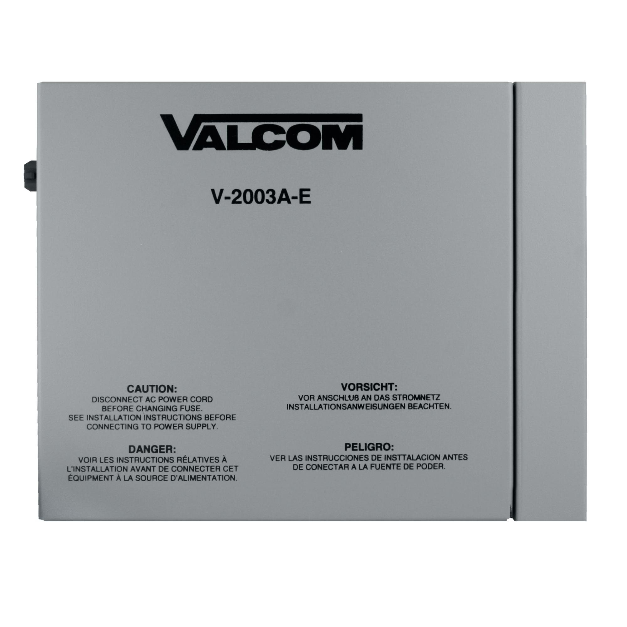 Valcom's V-2001A-E One Zone, One-Way Enhanced Page Control Unit, European Version is an integrated page control unit equipped with a power supply to provide additional power to Valcom self-amplified speakers and horns. The built-in tone generator (single and warble) allows for night rings and break tones after normal business hours. The V-2001A-E enables you to do emergency page overrides for priority announcements.