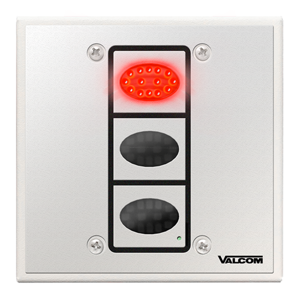 Valcom's VIP-996 Threat Level Indicator is ideal for a variety of scenarios or indoor area protocols where visible alerting by colors and patterns are needed. The colors of the indicators are physically located like the international standard of red at top, yellow in the middle and green on the bottom. This universally recognized pattern and colors enhances recognition of threat level based on color and position. Ideal for silent alerting and situational awareness in indoor environments.