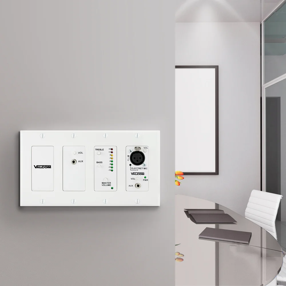 Valcom’s V-9985-W Four Channel In-Wall Mixer is a cost-effective solution that eliminates the use of expensive in-wall amplifiers. The complete sound system is ideal for conference rooms, lecture halls, restaurants, auditoriums and gymnasiums.