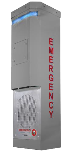 The VE9895EM-GR Vandal-Resistant Wall Mount IP Emergency Talkback Call Tower provides one-way or two-way communication to multiple answer locations. When in idle mode a constant blue beacon is provided allowing rapid recognition by users. Pressing the “Call” button on the call station initiates a call to any SIP telephone, SIP address, Valcom intercom station or to a Valcom IP gateway. In addition, the high-intensity strobe begins to flash providing rapid identification of the unit location. When the called party answers, a handsfree talkback communication is enabled. When the called party terminates the call, the connection is terminated automatically, and the strobe returns to beacon mode. The tower is available in painted CRS steel or brushed stainless steel. The VE9895EM-GR is an excellent choice for: university dormitory entrances, building hallways, parking decks and public transit centers (bus, rail & airports).