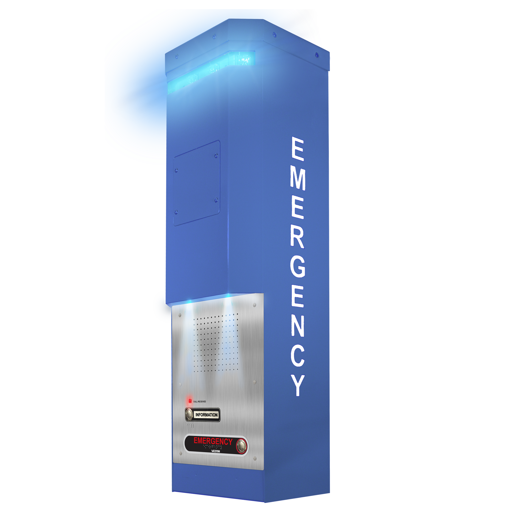 The VE9895AEM-BLW Vandal-Resistant Wall Mount IP Emergency Talkback Call Tower provides one-way or two-way communication to multiple answer locations. When in idle mode a constant blue beacon is provided allowing rapid recognition by users. Pressing the “Call” button on the call station initiates a call to any SIP telephone, SIP address, Valcom intercom station or to a Valcom IP gateway. In addition, the high-intensity strobe begins to flash providing rapid identification of the unit location. When the called party answers, a handsfree talkback communication is enabled. When the called party terminates the call, the connection is terminated automatically, and the strobe returns to beacon mode. The tower is available in painted CRS steel or brushed stainless steel. The VE9895AEM-BLW is an excellent choice for: university dormitory entrances, building hallways, parking decks and public transit centers (bus, rail & airports).