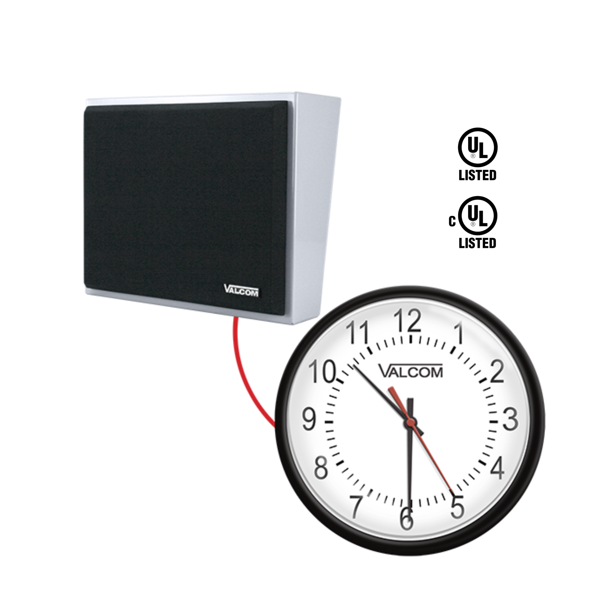 The VE4171-A12 IP Metal Wall Speaker and Analog Clock Kit includes a 12-inch analog clock and a metal wall speaker. This provides synchronized time, talkback intercom and loudspeaker paging from one IP network connection. The 12-inch Analog Clock can be programmed to sync with any NTP (Network Time Protocol) server. The clock enclosure is constructed of steel with a durable black powder coated finish. The speaker enclosure is made of steel with a gray durable powder coated finish. The color of the enclosures can be easily changed to match any décor. A black cloth covered detachable grille is included with the speaker. Power is provided to both the clock and speaker via a Power over Ethernet (PoE) switch meeting the 802.3af specification.