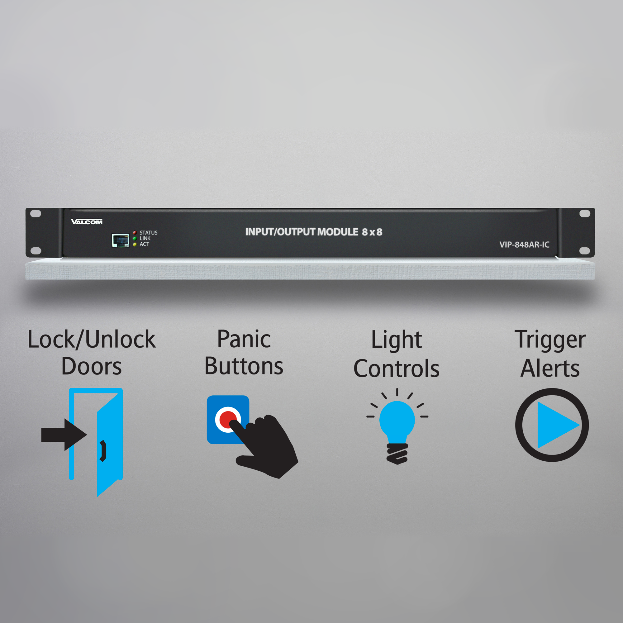 With Valcom’s VIP-848AR-IC, you can easily control and monitor virtually any type 3rd party system and device with the 8 input, 8 output contact controller. Multiple devices can easily be connected and controlled via schedules or during emergencies including, but not limited to the following: